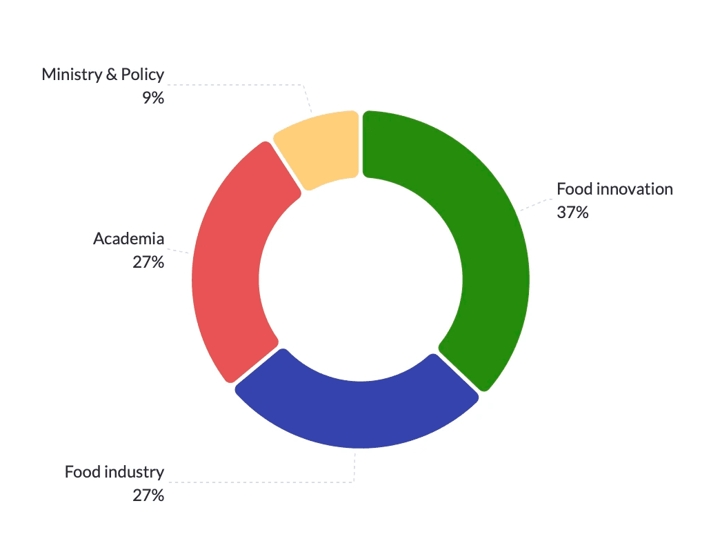 Over these months, more than 200 people participated across workshops, open events, and interviews. The group was truly interdisciplinary: 37% from food innovation, 27% from the greater food industry, 27% from academia, and 9% from ministries and policy.